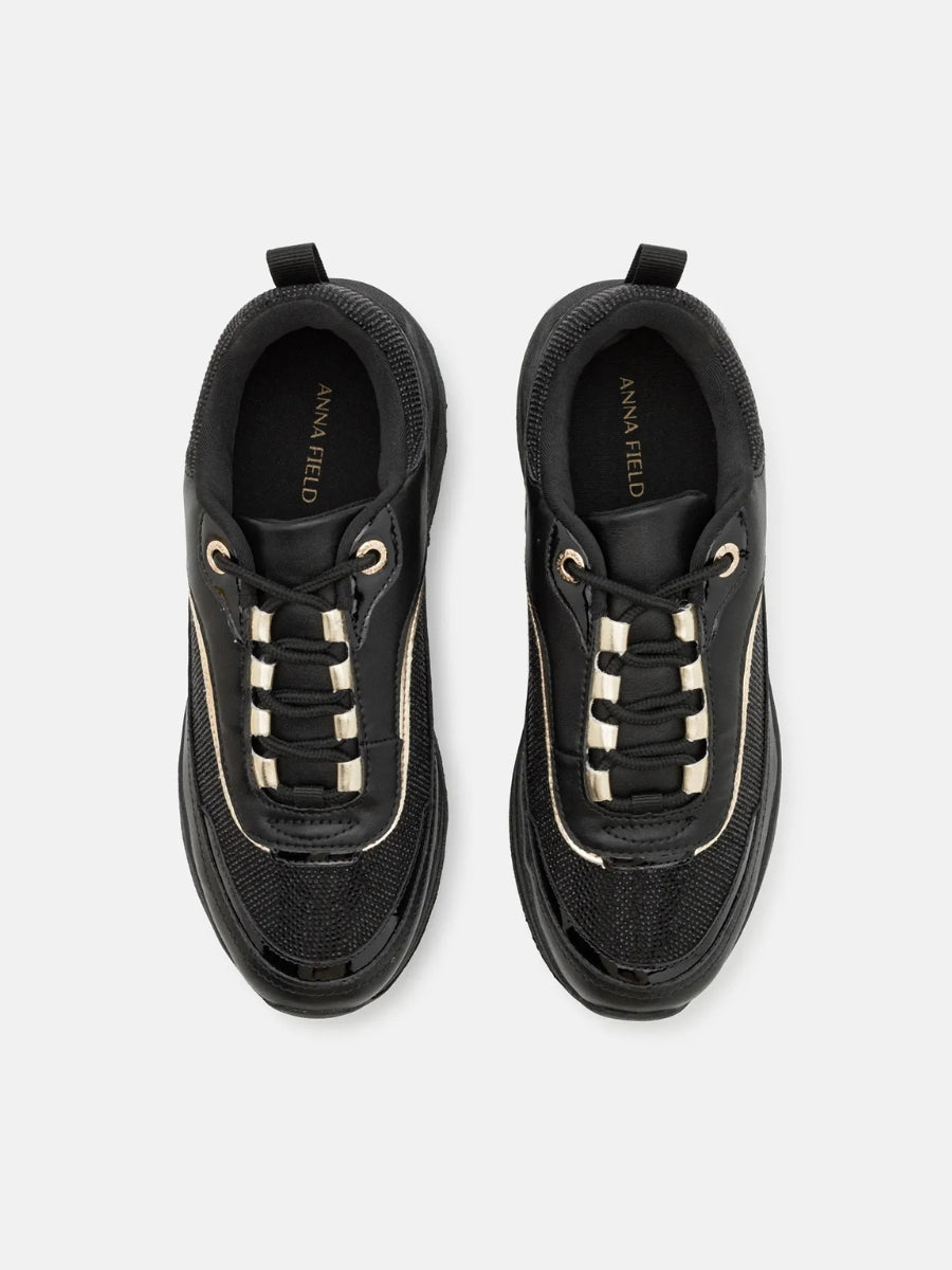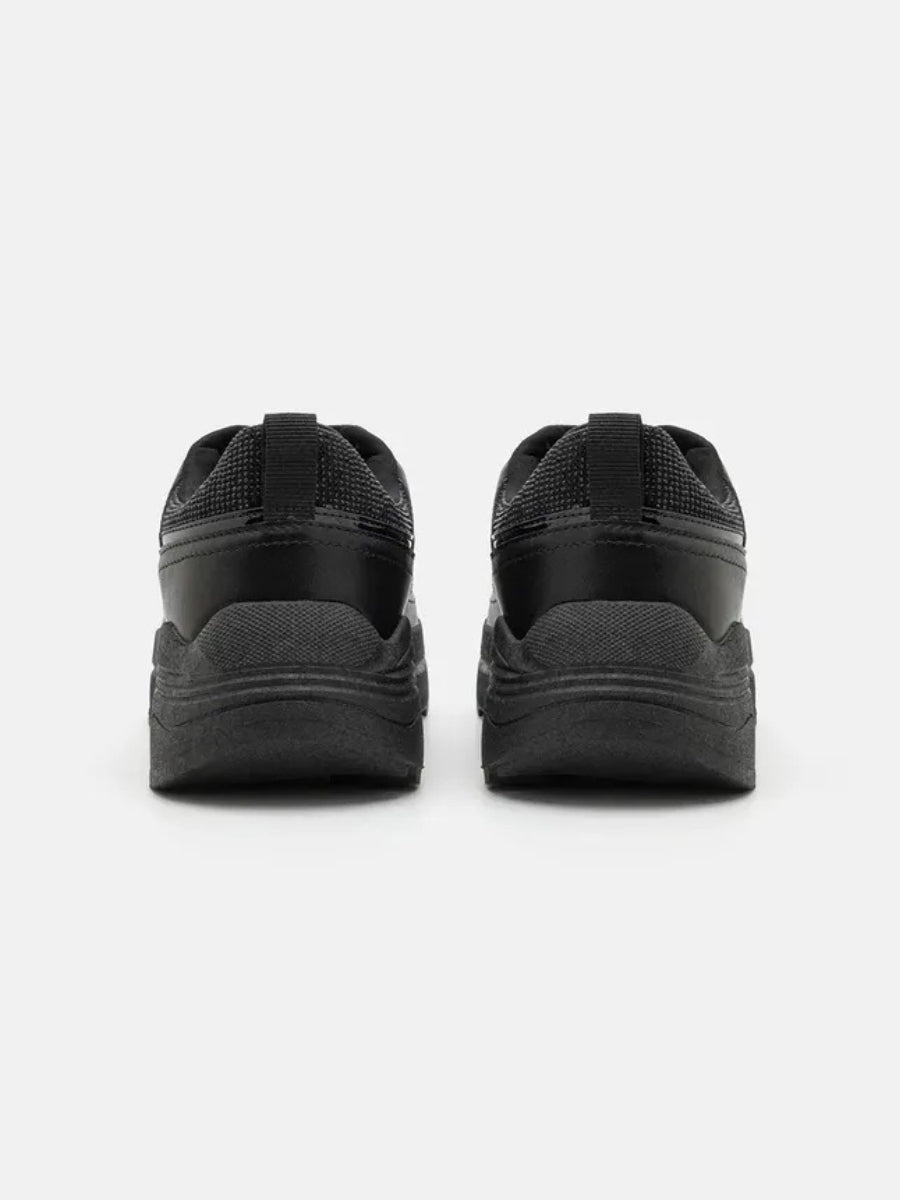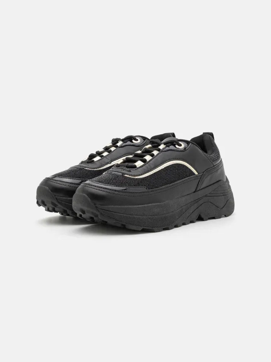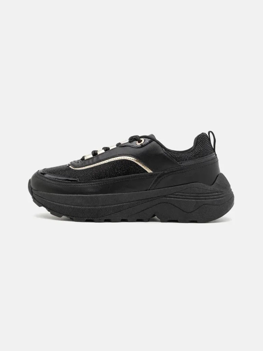 Dale altura a tu estilo. Estas zapatillas negras con plataforma combinan texturas suaves y detalles brillantes para un look moderno y femenino. La suela gruesa aporta comodidad y presencia, mientras que los acabados dorados le dan un toque elegante que eleva cualquier outfit urbano.
