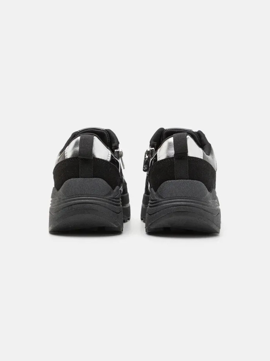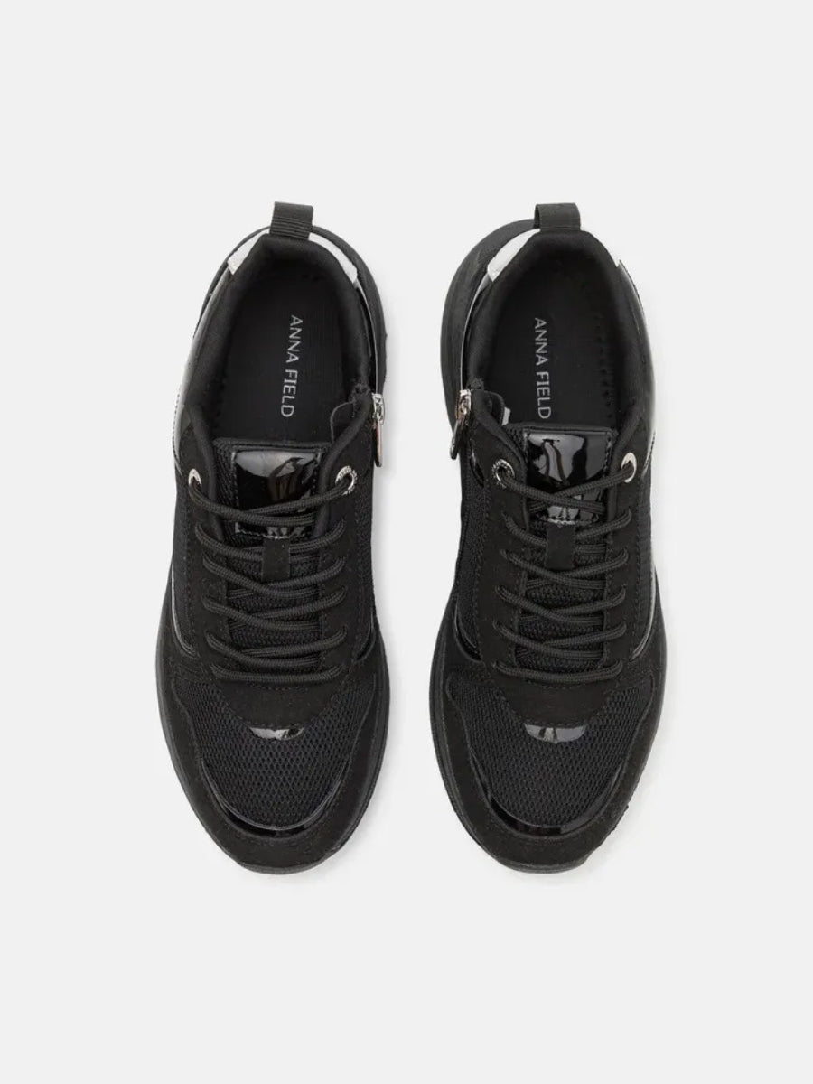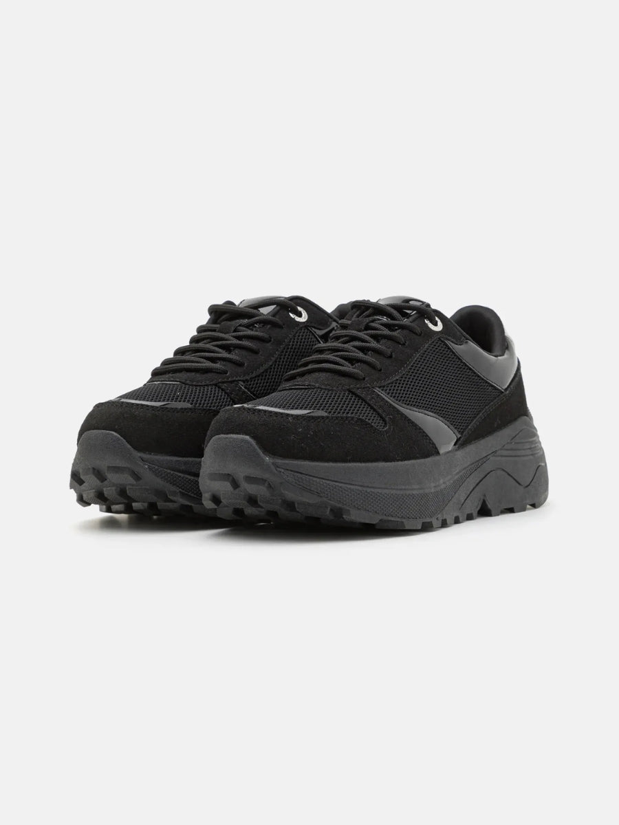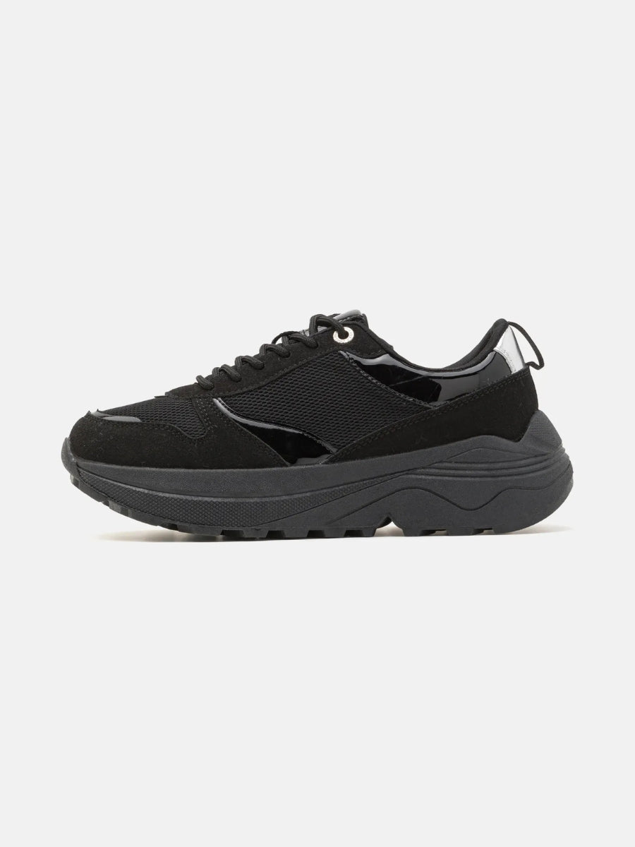 Minimalismo con carácter. Estas zapatillas negras combinan materiales brillantes y malla para un look sofisticado con estilo deportivo. La plataforma robusta aporta altura y comodidad en cada paso, perfecta para destacar sin esfuerzo.