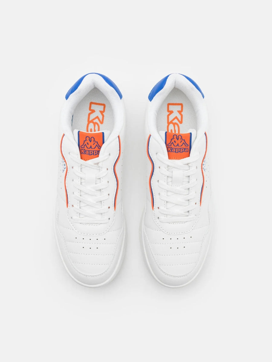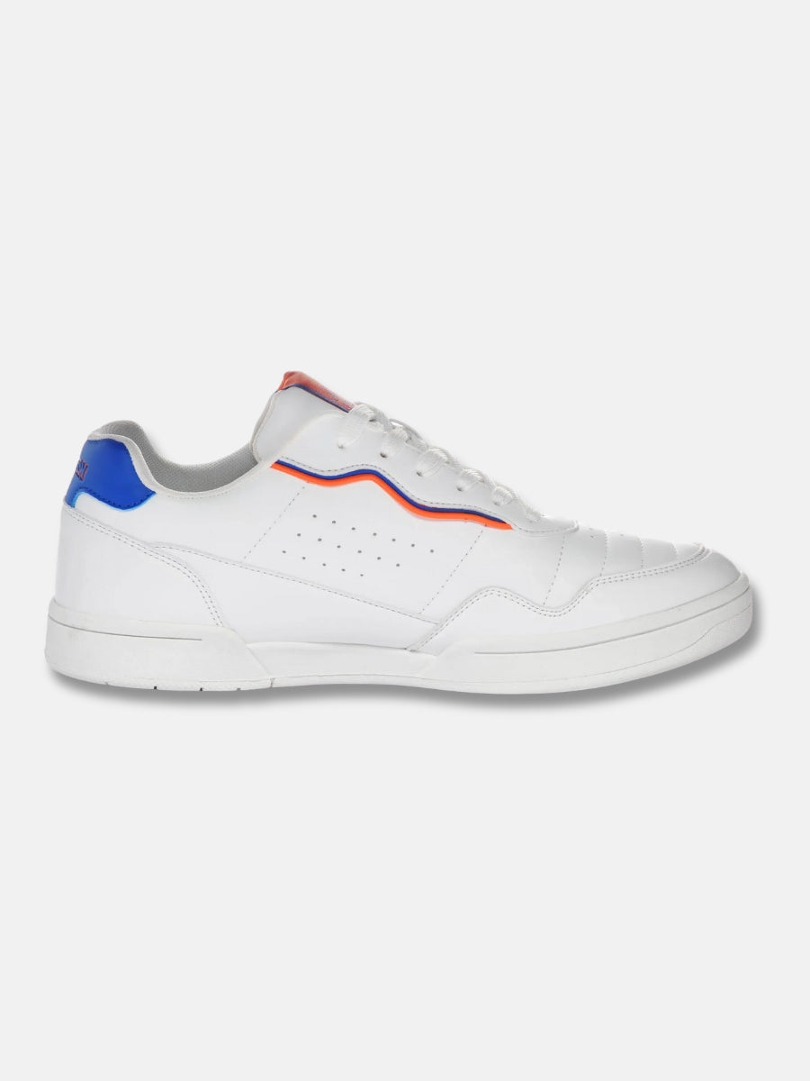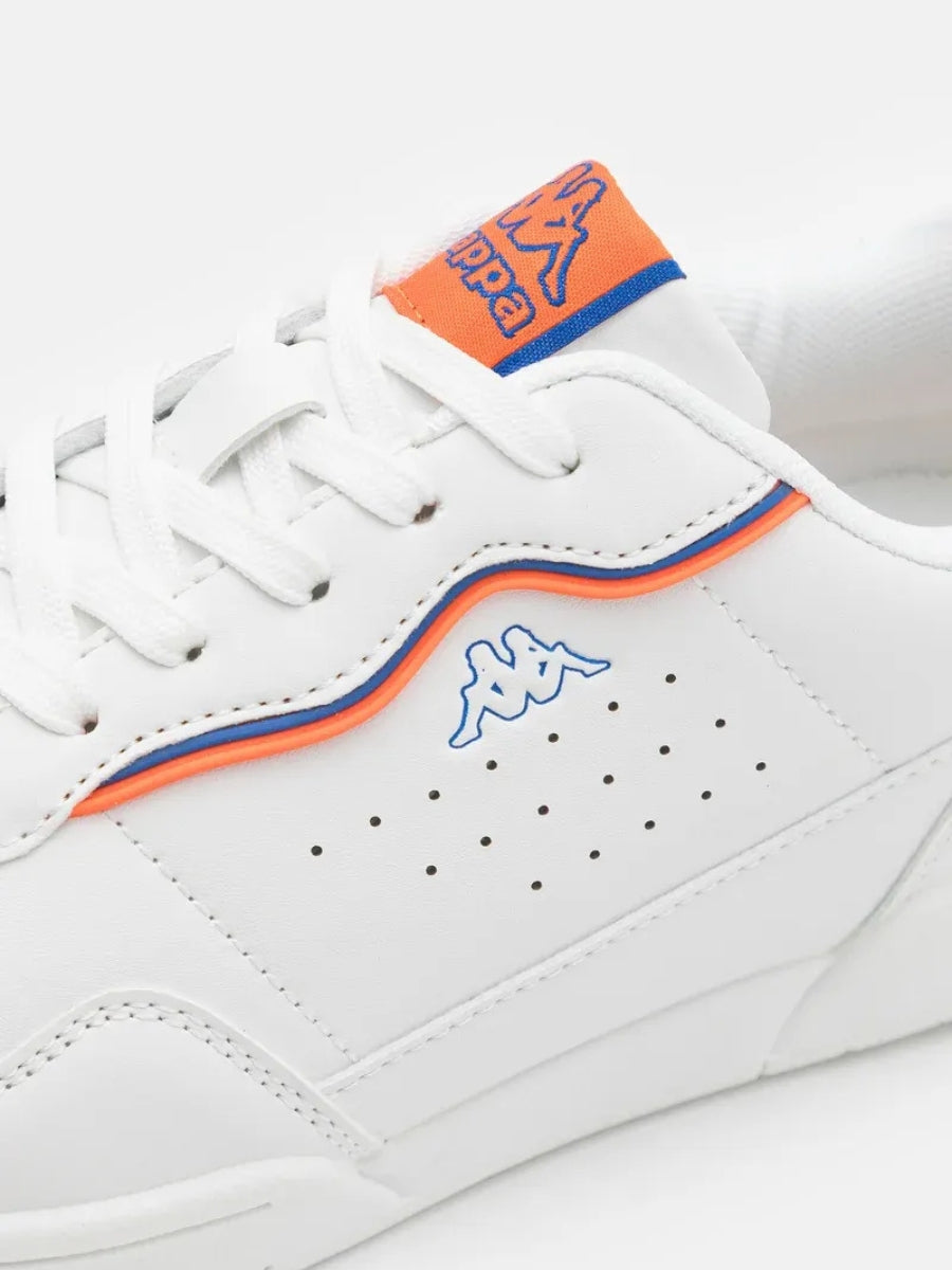 Diseño retro con energía urbana. Estas zapatillas unisex en blanco destacan por sus detalles en azul y naranja que aportan un contraste vibrante. Con líneas limpias, perforaciones laterales para transpirabilidad y suela sólida, ofrecen comodidad en cada paso. Un básico versátil con personalidad deportiva.